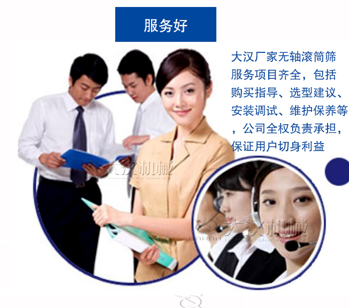 大漢廠家無軸滾筒篩服務項目齊全,包括購買指導、選型建議、安裝調試、維護保養等,公司全權負責承擔,保證用戶切身利益。