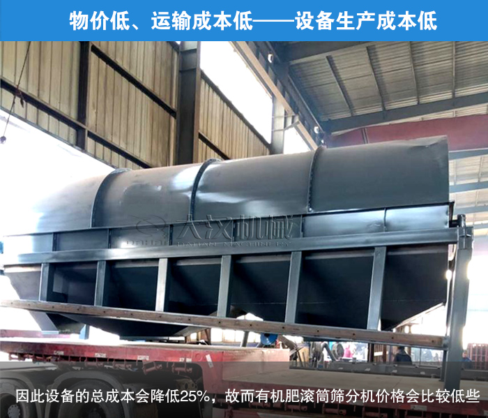 大漢公司位于新鄉(xiāng)大漢,設(shè)備的運(yùn)輸非常方便快捷、省時(shí)省力,免除了40%以上的成本費(fèi)用,且新鄉(xiāng)人力、物力資源豐富,生產(chǎn)設(shè)備花費(fèi)的制造成本也相對(duì)減少10%左右,因此設(shè)備的總成本會(huì)降低25%,故而有機(jī)肥滾筒篩分機(jī)價(jià)格會(huì)比較低些。