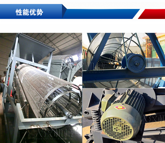 滾筒式篩沙機,即滾筒篩沙機,按照用戶產量的大小可以分為大型滾筒式篩沙機或小型滾筒式篩沙機,是分選技術中應用非常廣泛的一種新型篩料設備。它克服了圓振動篩和直線篩在篩分較濕物料時出現的篩網堵塞問題,提高了篩分系統的產量和可靠性。