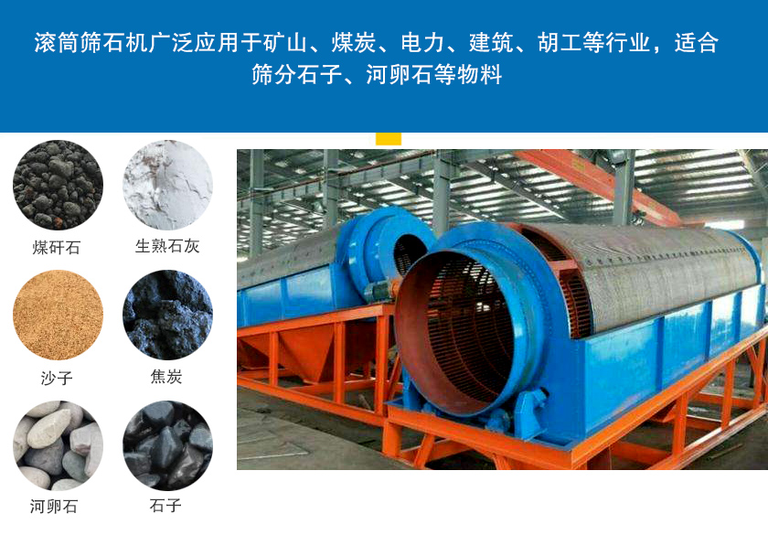 滾筒篩石機廣泛應用于礦山、煤炭、電力、建筑、胡工等行業,適合篩分石子、河卵石等物料,也可用戶篩分煤矸石、生熟石灰、沙子、焦炭等潮濕性易堵塞的物料。