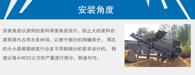 安裝角度以滾筒的廢料滑落角度設計,防止大的廢料在滾筒篩內占用太多時間,以便于細沙的篩分, 網孔的大小是根據建筑行業多不同粗細沙的要求設計的, 轉速以每小時25立方的產量進行篩分,轉速均勻。