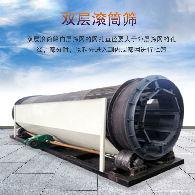 雙層滾筒篩是采用雙層篩網,可以將物料的規格進行兩次篩分,達到除去雜質的作用,可以有效提高成品物料的質量,雙層滾筒篩內層篩網的網孔直徑要大于外層篩網的孔徑,篩分時,物料先進入到內層篩網進行粗篩,篩下較細的物料再經由外層篩網進行二次篩分,一方面,可減少堵塞現象,還可以提高篩分精度。雙層滾筒篩可以根據物料的性質(纏繞性)采用有軸或無軸設計。
