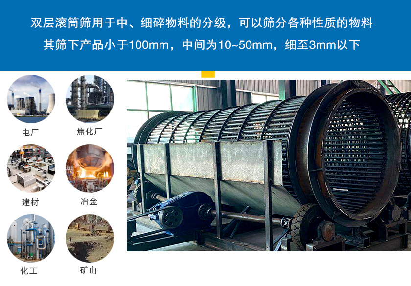 焦化廠:在焦化廠中,雙層滾筒篩可用于焦炭、焦粉等物料的篩分,確保生產過程的順利進行。