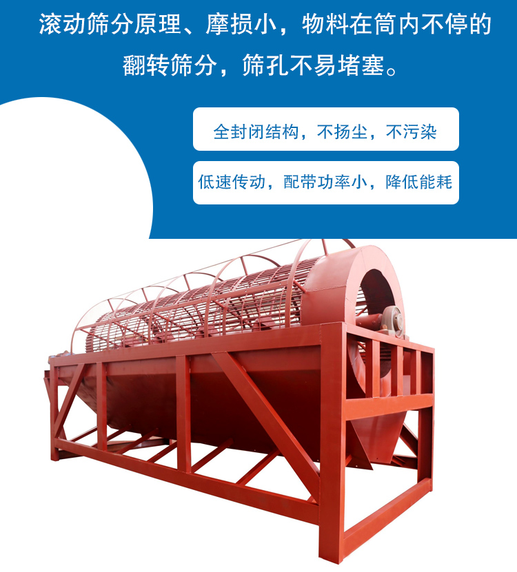 1、滾動篩分原理、摩損小,物料在筒內不停的翻轉篩分,篩孔不易堵塞。