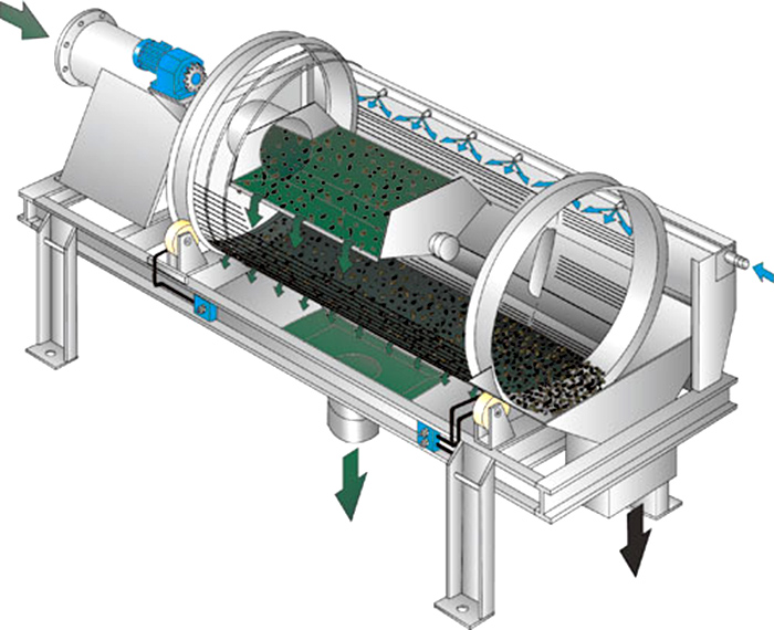 滾筒裝置在驅動裝置的驅動下轉動,當物料進入滾筒裝置后,由于滾筒裝置的傾斜與轉動,使篩面上的物料翻轉與滾動,使合格物料(篩下產品)經滾筒后端底部的出料口排出,不合格的物料(篩上產品)經滾筒尾部的排料口排出。