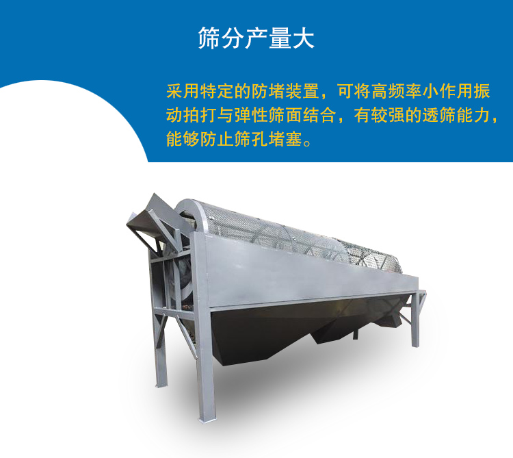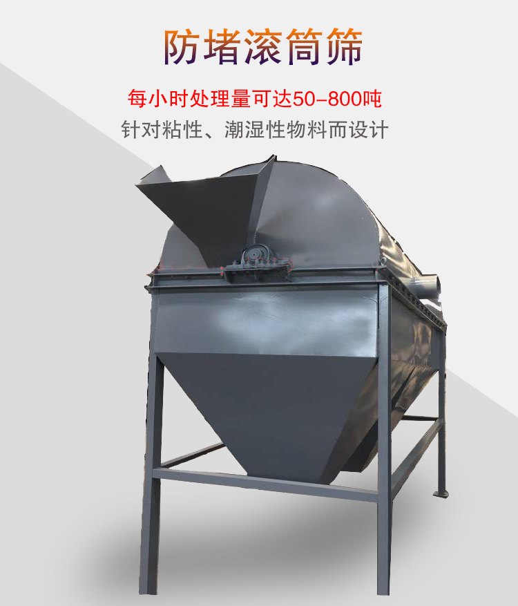 防堵滾筒篩由于設(shè)置有防堵裝置,其產(chǎn)量相較普通滾筒篩會(huì)提高20%。