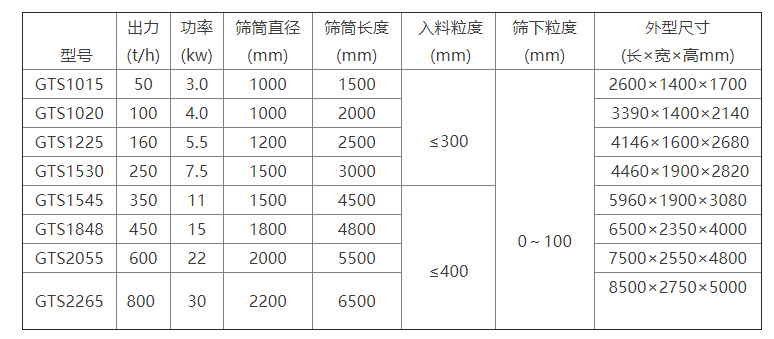 當滾筒篩啟動后,電動機經減速機與滾筒裝置通過聯軸器連接在一起,驅動滾筒裝置繞其軸線轉動,河沙進入滾筒裝置后,由于滾筒裝置的傾斜與轉動,使篩面上的河沙翻轉與滾動,合格產品經滾筒后端底部的出料口排出,不合格的河沙經滾筒尾部的排料口排出。由于河沙在篩分過程中不停地翻轉、滾動,使卡在篩孔中的河沙被彈出,有效防止篩孔堵塞。