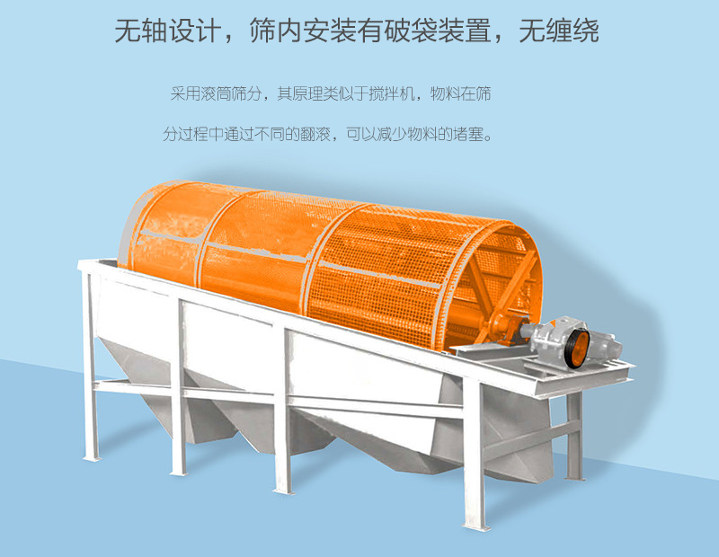 2、采用滾筒篩分,其原理類似于攪拌機,物料在篩分過程中通過不同的翻滾,可以減少物料的堵塞。