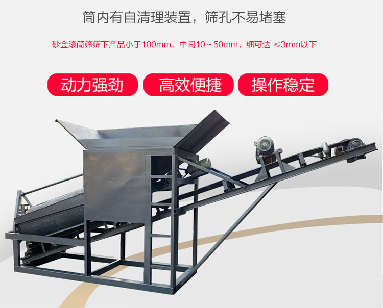 砂金滾筒篩篩下產(chǎn)品小于100mm,中間10~50mm,細(xì)可達(dá) ≤3mm以下。
