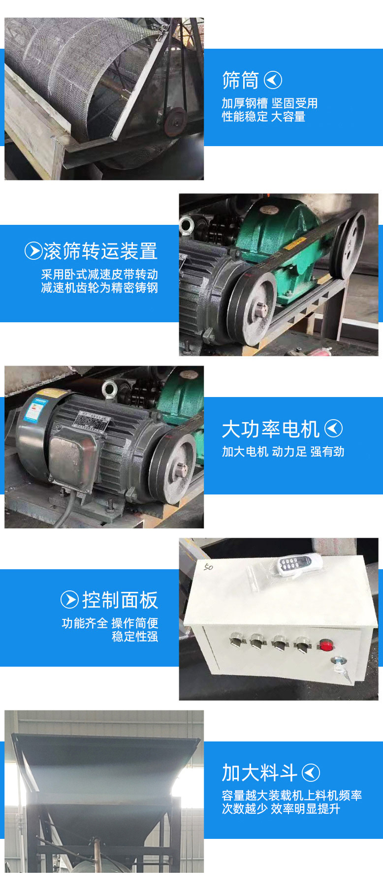 4、筒內(nèi)有自清理裝置,篩孔不易堵塞。