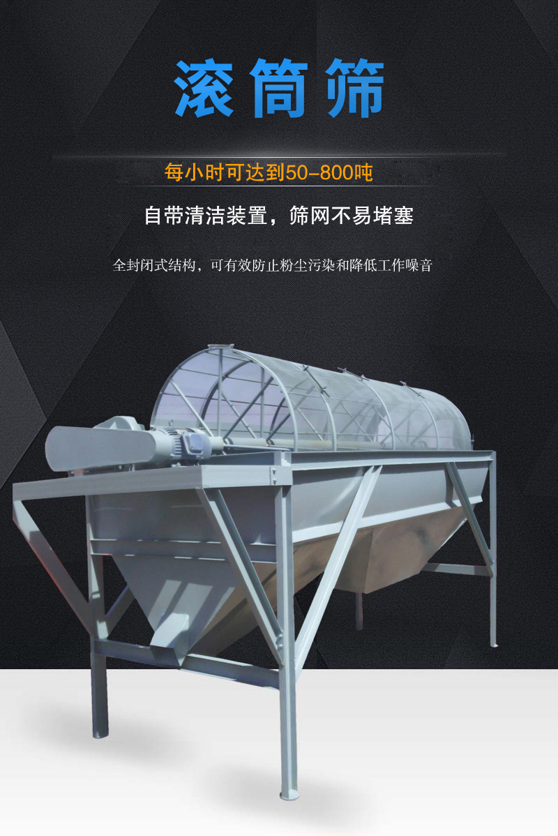 1、運用滾筒篩分原理,物料在篩分過程中不停地翻轉(zhuǎn),可以減少物料堵塞。