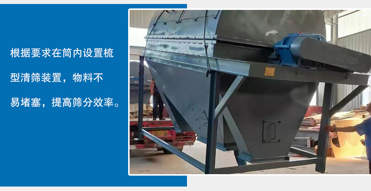 圓筒篩主要由滾筒裝置、電機、篩內(nèi)清潔裝置、底部支架、密封罩、出料口、進料口等組成,筒體呈傾斜放置,并被防塵罩罩住,生產(chǎn)過程中幾乎無粉塵和噪音污染。