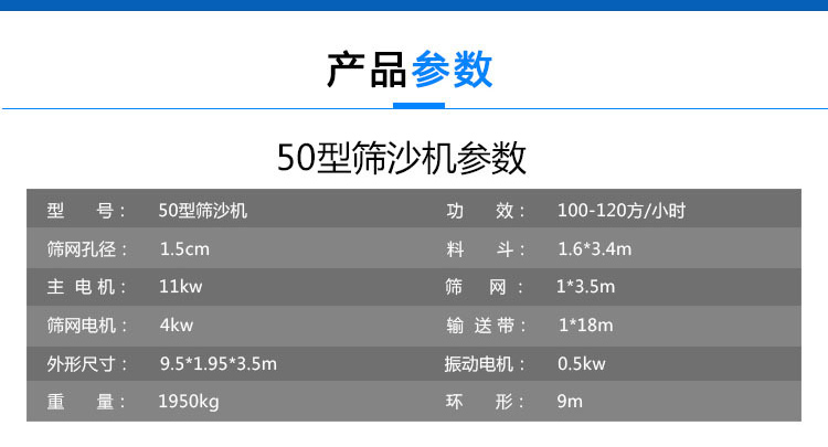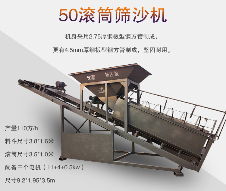 50滾筒篩沙機作為篩沙機中比較大的一款,性價比高,產量110方/h,料斗尺寸3.8*1.6米,滾筒尺寸3.5*1.0米,配備三個電機(11+4+0.5kw),尺寸9.2*1.95*3.5m,機身采用2.75厚鋼板型鋼方管制成,更有4.5mm厚鋼板型鋼方管制成,堅固耐用。