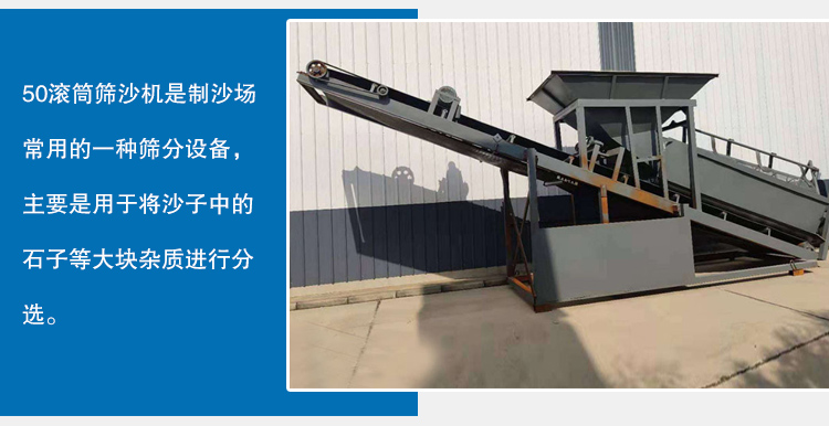 50滾筒篩沙機是制沙場常用的一種篩分設備,主要是用于將沙子中的石子等大塊雜質進行分選。