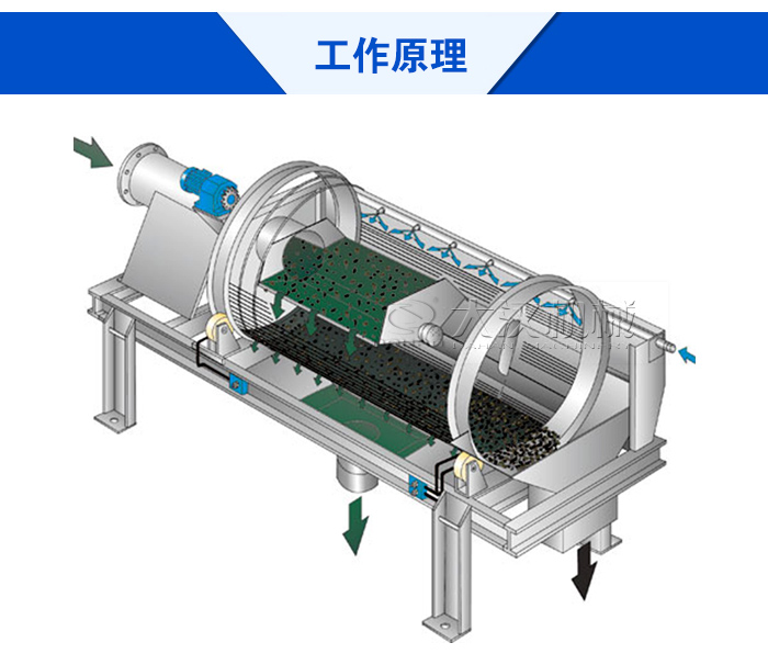 陶瓷油料滾筒篩主要有電機(jī)、減速機(jī)、滾筒裝置、機(jī)架、密封蓋、進(jìn)出料口組成。滾筒裝置傾斜安裝于機(jī)架上。 電動機(jī)經(jīng)減速機(jī)與滾筒裝置通過聯(lián)軸器連接在一起,驅(qū)動滾筒裝置繞其軸線轉(zhuǎn)動。當(dāng)物料進(jìn)入滾筒裝置后,由于滾筒裝置的傾斜與轉(zhuǎn)動,使篩面上的物料翻轉(zhuǎn)與滾動,使合格物料(篩下產(chǎn)品)經(jīng)滾筒外圓的篩網(wǎng)排出,不合格的物料(篩上產(chǎn)品)經(jīng)滾筒末端排出。由于物料在滾筒內(nèi)的翻轉(zhuǎn)、滾動,使卡在篩孔中的物料可被彈出,防止篩孔堵塞。